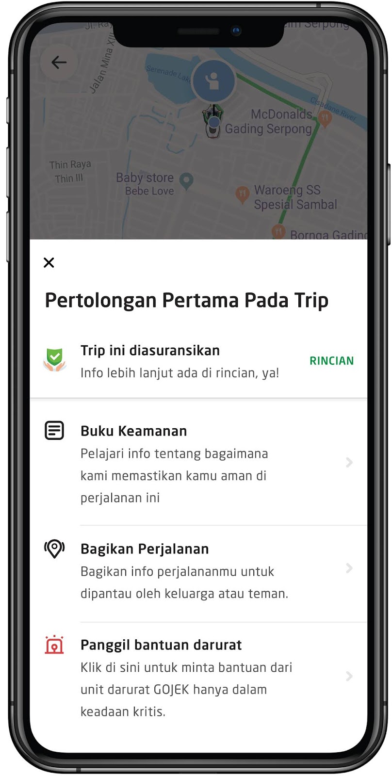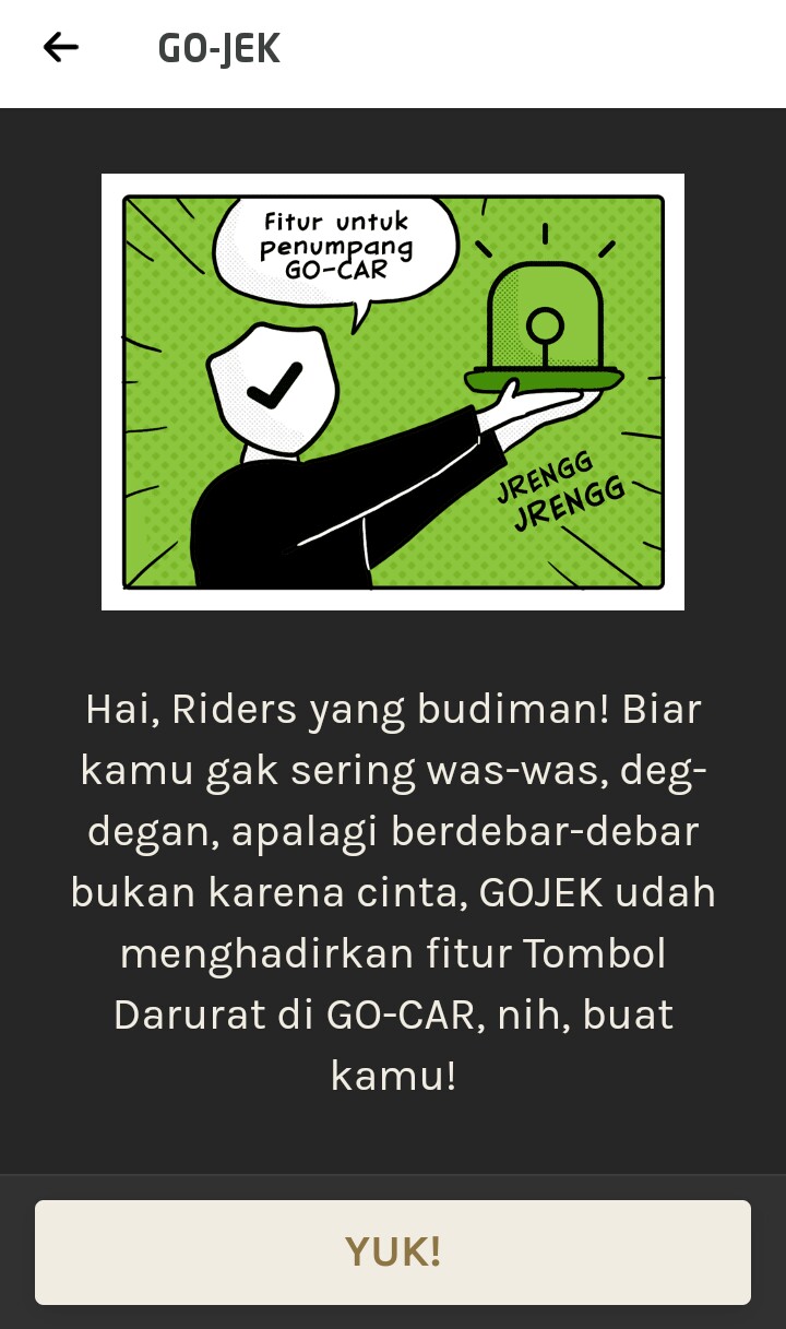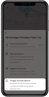 Sebuah fitur yang memungkinkan kita pengguna GOJEK mendapatkan rasa aman yang lebih. Karena GOJEK sudah menyiapkan pertolongan untuk kondisi terburuk, kecelakaan dan tindak kriminal di jalanan yang kita lalui. Tombol tersebut akan langsung terhubung pada Unit Darurat GOJEK yang siap melayani 24 jam setiap hari dari senin sampai minggu. Fitur panggil bantuan darurat ini sudah tersedia untuk layanan GO-CAR seluruh Indonesia.