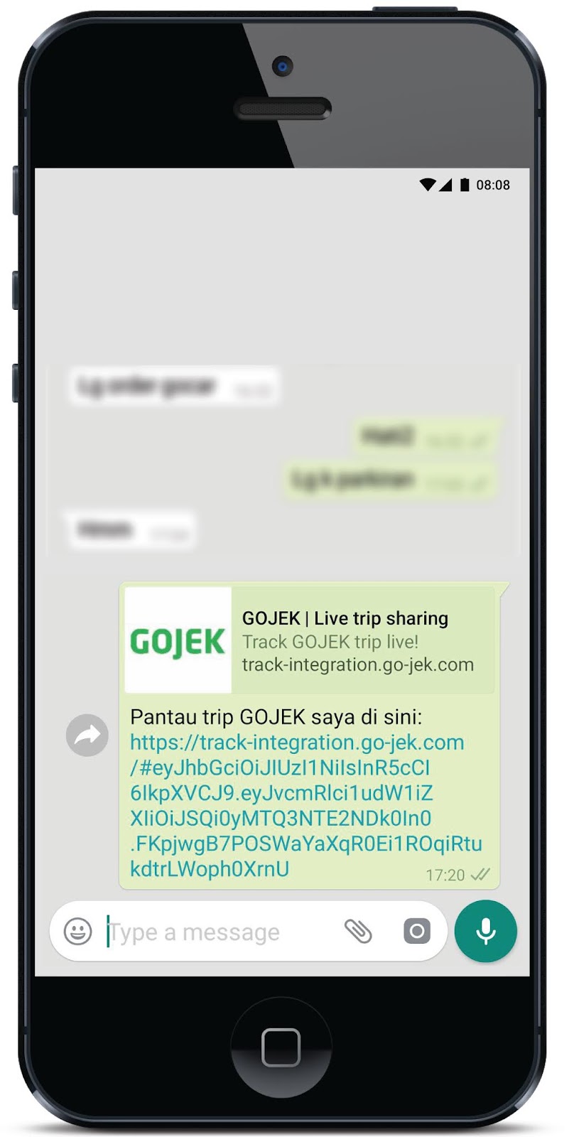 Jika saya klik tautan link bagikan perjalanan setelah booking GOJEK, informasi yang dibagikan adalah informasi lokasi saya baik ketika penjemputan maupun turun dari kendaraan, informasi pengendara secara detail (nama, nomor & jenis kendaraan dan nomor pemesanan) serta lokasi saya sekarang bisa dilihat oleh keluarga terdekat.