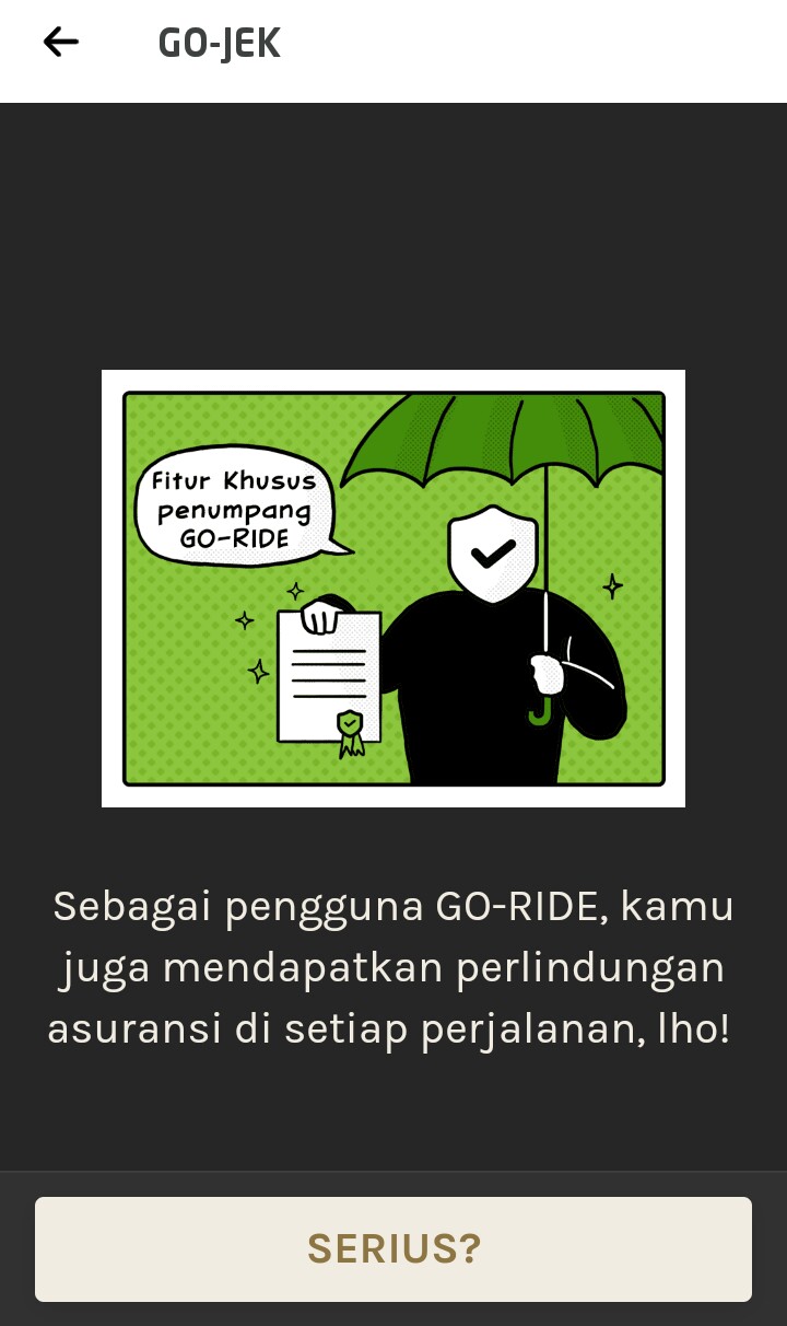 GOJEK bekerjasama dengan platform asuransi digital memberikan perlindungan asuransi untuk pengguna layanan GO-RIDE. Asuransi penumpang ini merupakan bentuk nyata GOJEK dalam memberikan rasa keamanan, kenyamanan, hingga memastikan bahwa kita penumpang telah terlindungi dalam perjalanannya. Asuransi penumpang GO-RIDE ini otomatis aktif, berlaku se-Indonesia, dari waktu penjemputan hingga tiba di tujuan.