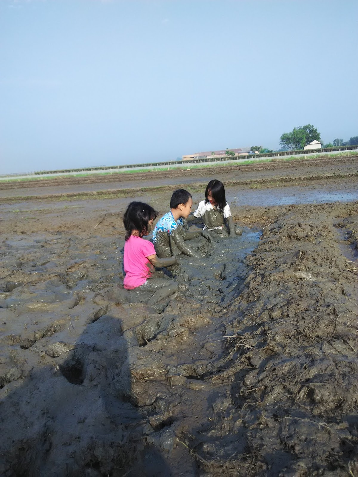 Depan rumah sawah terhampar luas. Tempat bermain yang pas untuk anak kami yang gak takut kotor.